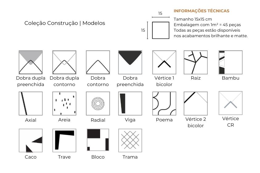 Em 2026, esse percurso se amplia. A partir do convite para dar continuidade à coleção, surgem novos desenhos que aprofundam a pesquisa iniciada e expandem seu vocabulário visual e sensível. Caco, Chapisco, Trama e Trave são releituras contemporâneas de elementos presentes no imaginário construtivo brasileiro, fragmentos, texturas e estruturas que evocam lembranças afetivas da arquitetura, agora reinterpretadas como linguagem de superfície.